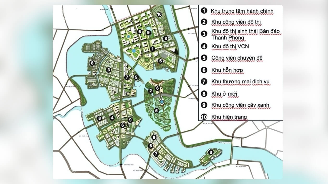 Phân khu 1 – Bán đảo đô thị sinh thái thông minh: rộng 68,55 ha, tập trung các công trình nhà ở kết hợp thương mại. Khu này ưu tiên kiến trúc xanh, tận dụng cảnh quan mặt nước tạo không gian mở gần gũi thiên nhiên. Các tòa chung cư cao tầng đều có tầm nhìn panorama hướng sông và biển, đón gió và ánh sáng tự nhiên tối đa. Khu nhà liền kề và shophouse ven sông được bố trí hài hòa, vừa để ở vừa kinh doanh.