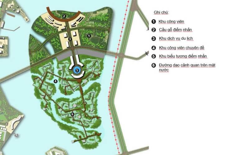 Công viên và cảnh quan xanh: Dự án chú trọng không gian xanh với công viên trung tâm rộng lớn và các đường dạo bộ ven sông thoáng mát. Đặc biệt, phân khu 2 được mệnh danh là “Đảo công viên giải trí quốc tế” rộng 51 ha, bao gồm công viên chủ đề theo chuẩn quốc tế và một công viên công cộng, phục vụ nhu cầu vui chơi, thư giãn cho cả cư dân lẫn du khách.